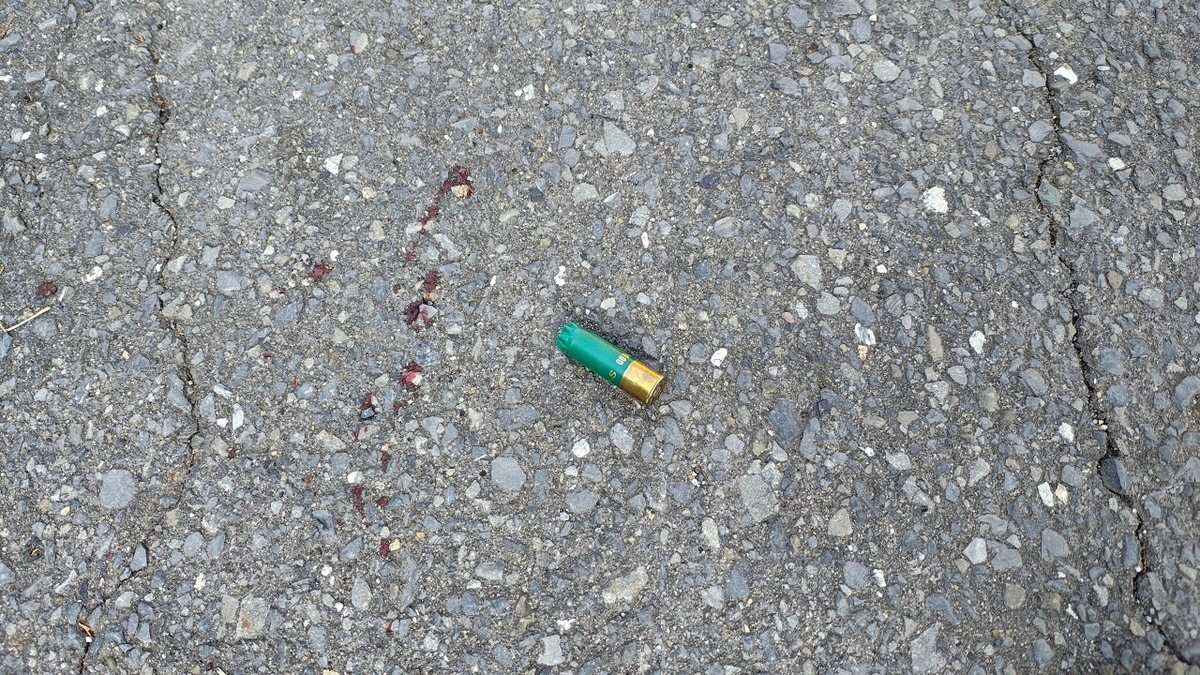 散弾銃で撃たれたのでしょう、そして車まで運ぶ途中ぽたぽた落ちた血液かな。